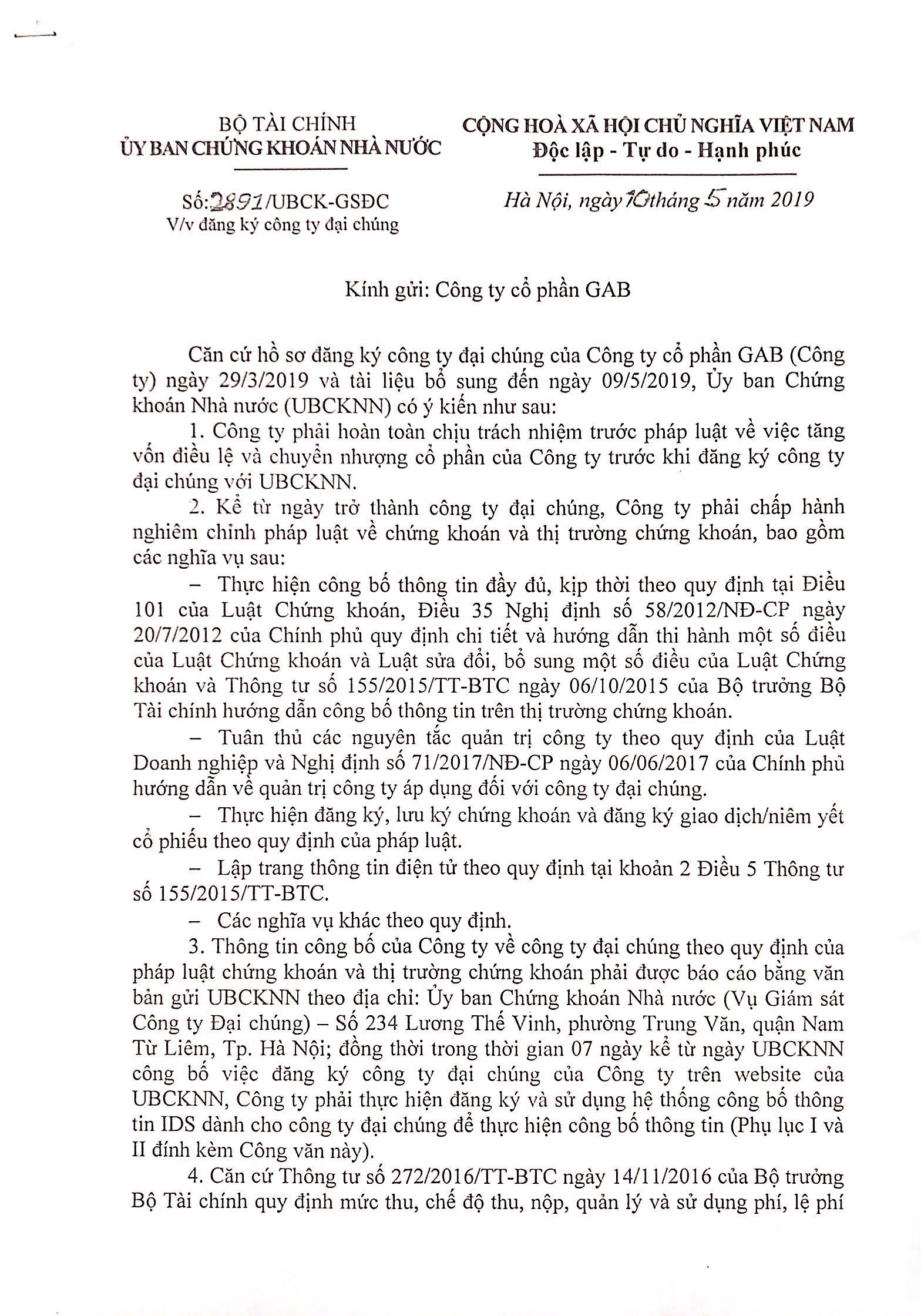 CTCP GAB xin trân trọng công bố tới Quý cổ đông chấp thuận và hướng dẫn của UBCK về việc trở thành Công ty đại chúng từ ngày nhận quyết định 10/05/2019 theo văn bản tại đường link tại đây